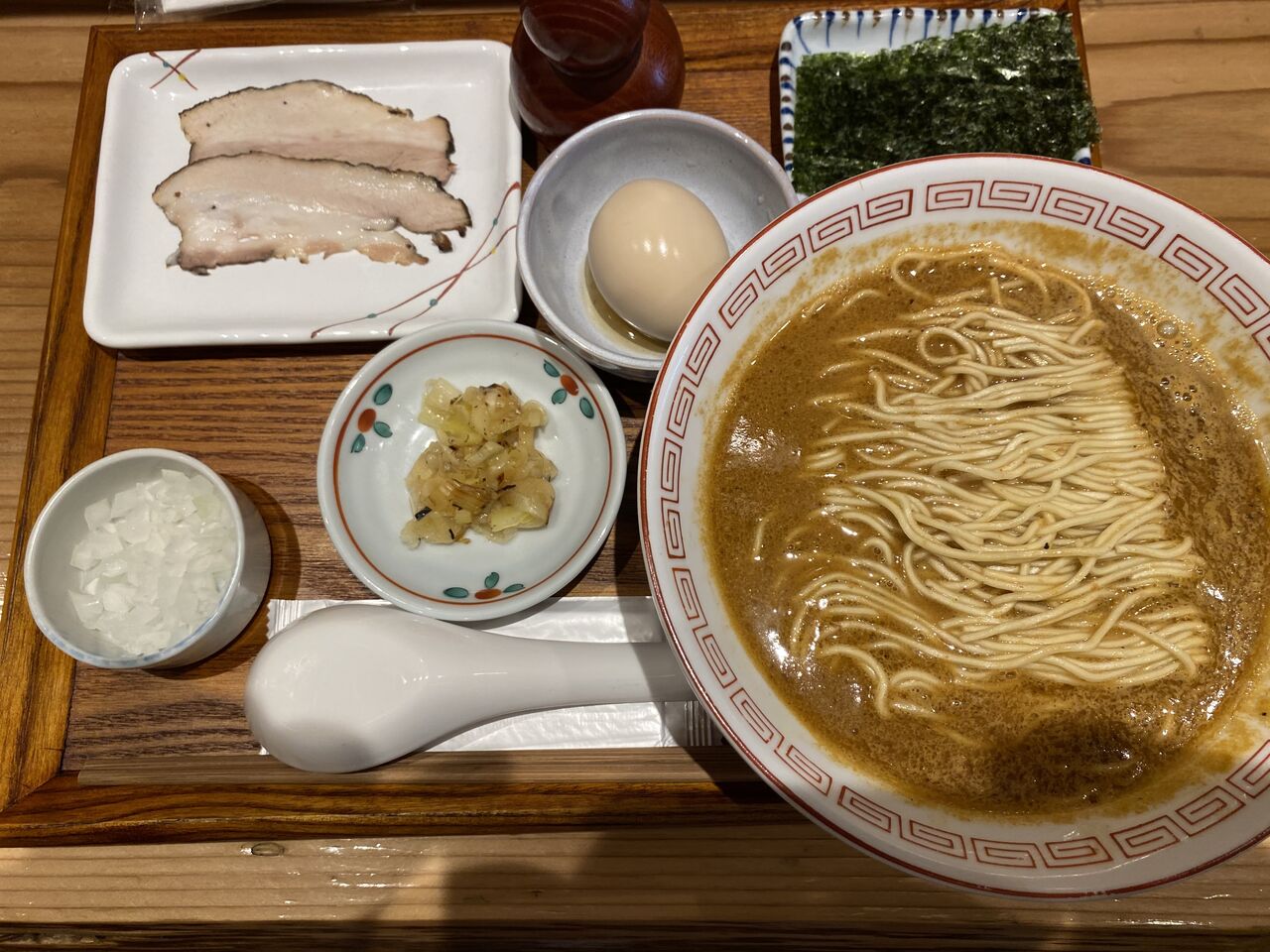 「鯖定食」(1,450円)を頂きました。スープを一口飲んだ瞬間に「鯖」が頭に浮かんでくる程の鯖の風味です。濃厚な味わいで、変なクセは一切なく、炭焼きの風味が加わって、ほんと美味しいです。麺は「三河屋」さん系の低加水の中細ストレート麺で、定番だけど安定感ある美味しさです。別皿のトッピングを少しずつスープに投入して、ご飯と一緒に頂きました。