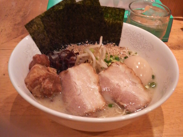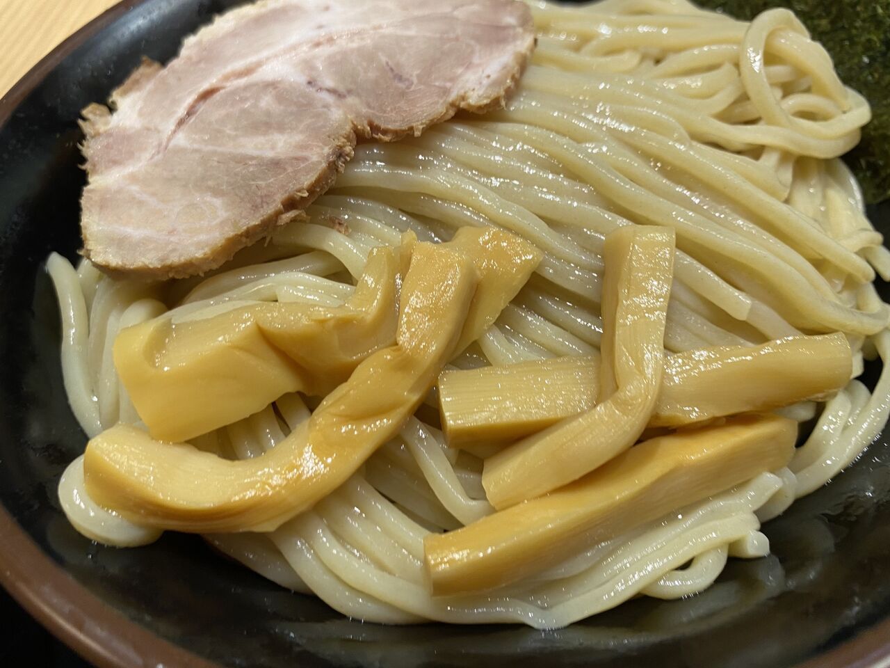「お、これは優しい系かな」と思った矢先に、後味にはビターな煮干しの旨味がじんわりと顔を出し、舌全体を包み込むように広がっていきます。これは美味しいですね。スープ温度が落ち着いてくると、煮干しの甘味は無くなって、動物系の旨味を下支えに、煮干しのビターな旨味が前面に出てきます。平打ちの手もみ麺はもっちり感があり、スープをしっかり引き上げてくれまして美味しいです。今回、この「焼きあご煮干し塩らぁめん」を選んだのは、他のメニューの麺は、煮干し系定番のパツンとした細ストレートだと案内があったからなのですが、この手もみ麺の方が面白味があって良い感じです。2種類のチャーシューと味玉も美味しかったです。スープまで残さず完食しました。